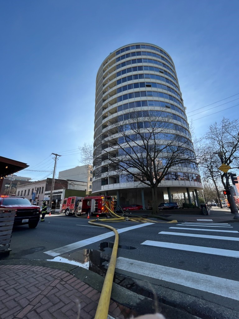 At 10:25 today Vancouver Fire was dispatched to the report of a high-rise fire in Smith Tower apartments at 515 Washington St in downtown Vancouver, WA. This fire was upgraded to a second alarm. We responded with a total of nineteen units consisting of twelve fire engines, three trucks and five chief officers. A total force of over fifty personnel responded to this emergency.