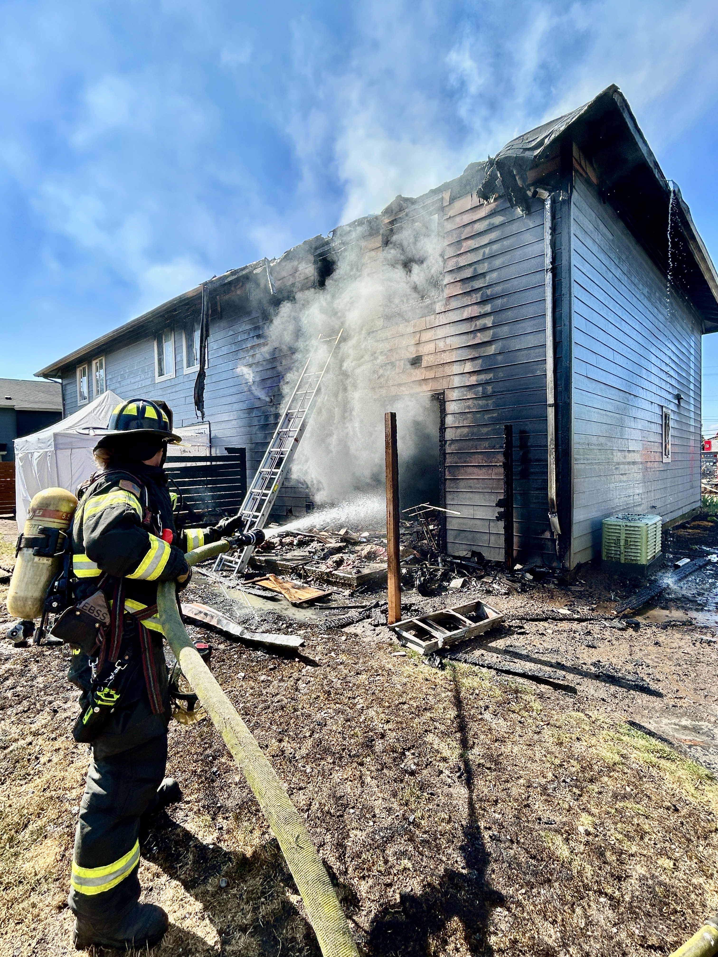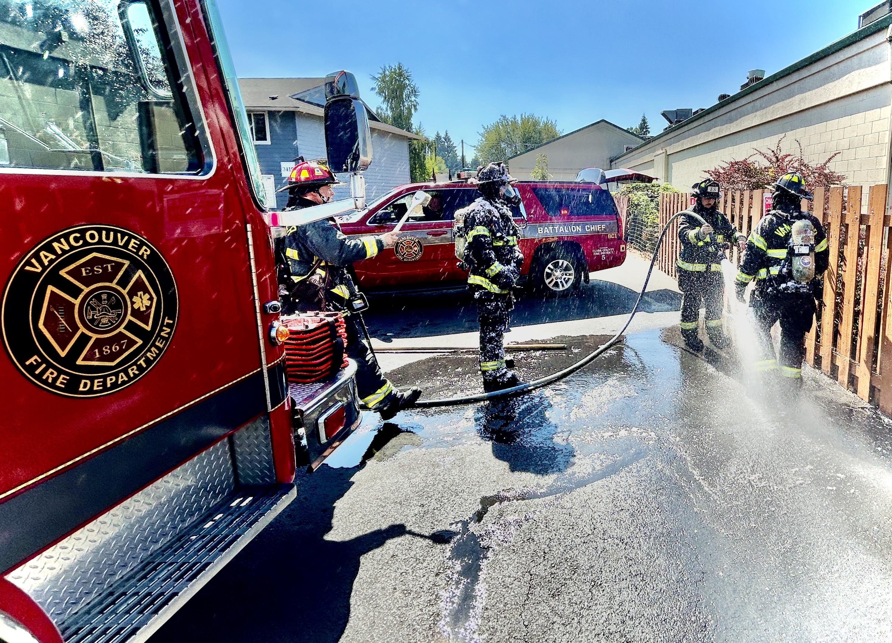 Vancouver Fire Department and Fire District 6 responded to an apartment fire around 11:30am on September 13th. Neighbors stated they heard several explosions prior to one of the triplex units catching on fire at 3412 NE 53rd St in Vancouver. First arriving units found heavy black smoke pouring from the front and rear doors of the left side 2 story apartment. Crews described the first floor as having heavy fire conditions that extended into the attic via siding on the back side of the apartment. A second alarm was called by the Battalion Chief in command that brought an additional compliment of Engines, Squads and Trucks to the scene. Aggressive yet calculated fire attack ensured the other 2 apartment units were protected from fire extension. Seven people are displaced due to the extensive fire damage to the attic. The profession often comes with known risks that all firefighters accept. One of the pictures shows a standard practice of decontaminating our turnout gear to decrease contact with toxic smoke and substances encountered during fires. Unfortunately one firefighter was transported to a local hospital in a stable condition after firefighting efforts. The Clark County Fire Marshals office is heading up the investigation.