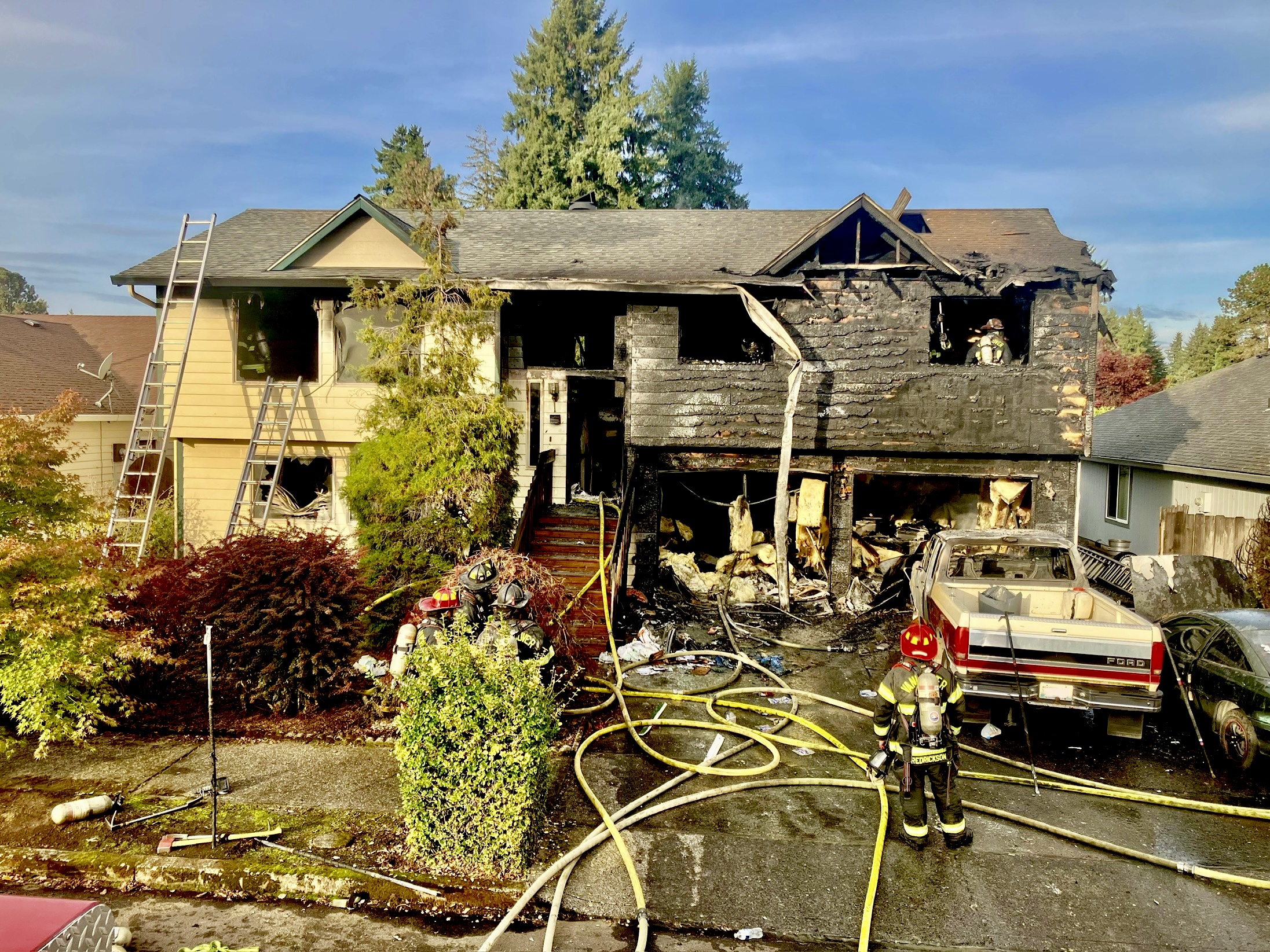 Vancouver Fire responded to a structure fire at 10008 NE 53rd Ave just after 8 am this morning, October 23rd. Several callers stated they heard explosions followed by large amounts of black smoke and flames. First arriving crews found heavy fire involvement in the garage and rooms above it as well as 2 vehicles parked in the driveway. Firefighters began extinguishing the wall of flames from the exterior prior to moving inside to search the 2 story home and continue fire suppression. Two residents were displaced following the tragic event. Fortunately, no human or pet lives were lost or injured. Six Vancouver Fire companies were also assisted by Fire District 6. Clark Country Fire Marshals are investigating the cause.