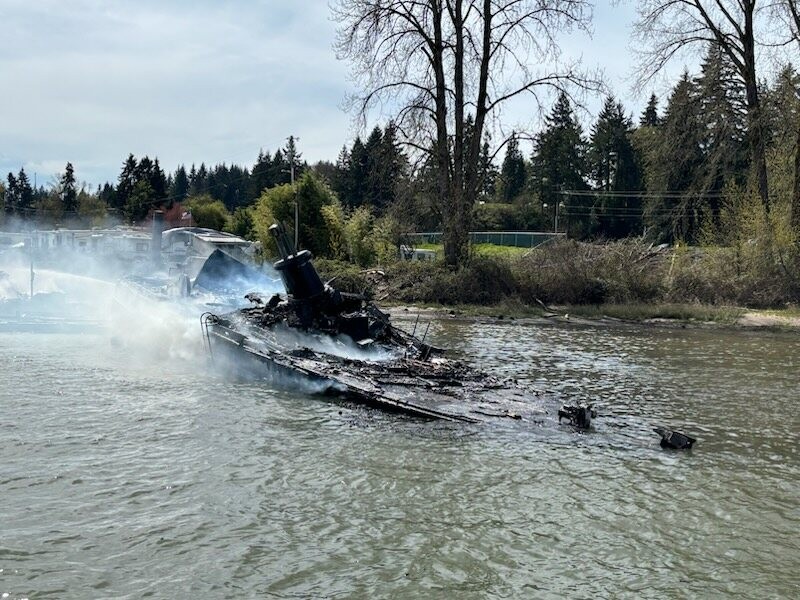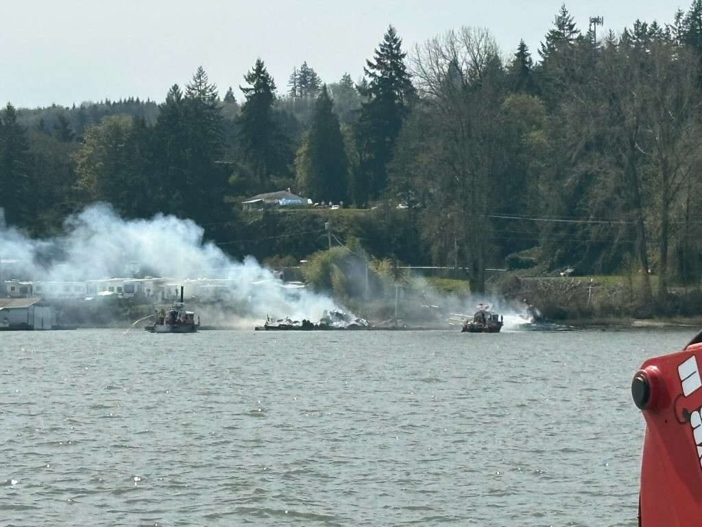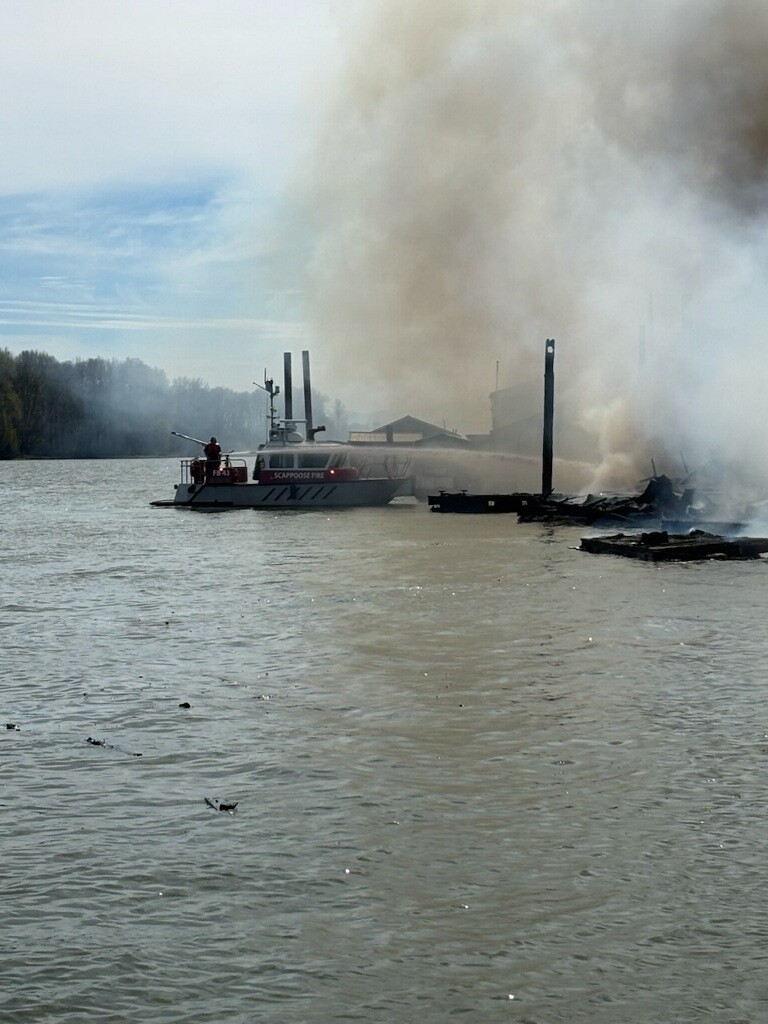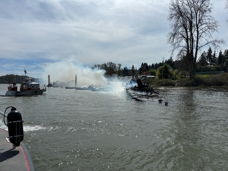 Vancouver, WA — At approximately 12:27 PM this afternoon, the Vancouver Fire Department responded to a mutual aid request from Clark-Cowlitz Fire and Rescue for a reported fire involving three large vessels and a dock at 70360 Columbia River Highway, identified as Goble Marina.