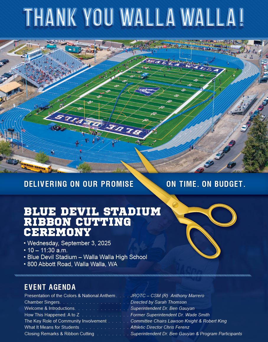 WALLA WALLA - Please join us for the official Ribbon Cutting Ceremony for the new Blue Devil Stadium Wednesday, Sept. 3 at 10 a.m. Walla Walla Public Schools has completed all the projects from the Capital Levy on time and on budget!
