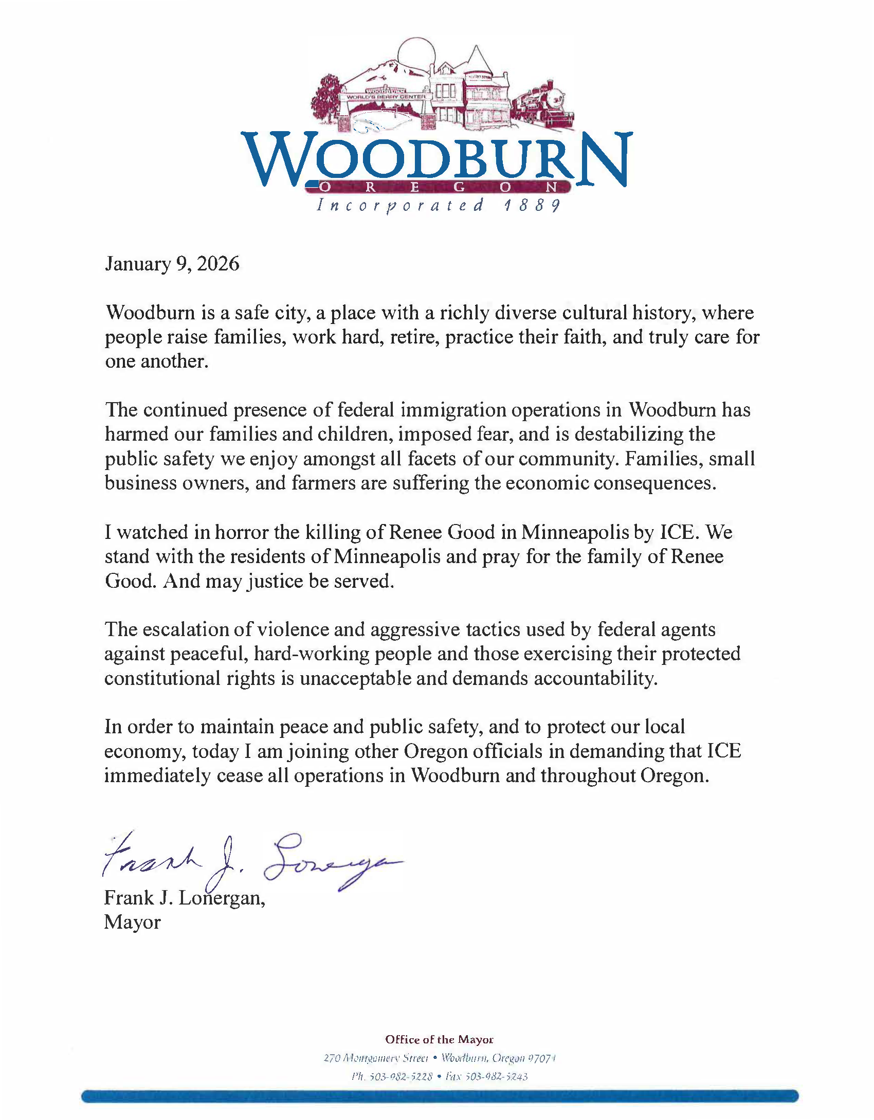 The continued presence of federal immigration operations in Woodburn has harmed our families and children, imposed fear, and is destabilizing the public safety we enjoy amongst all facets of our community. Families, small business owners, and farmers are suffering the economic consequences.