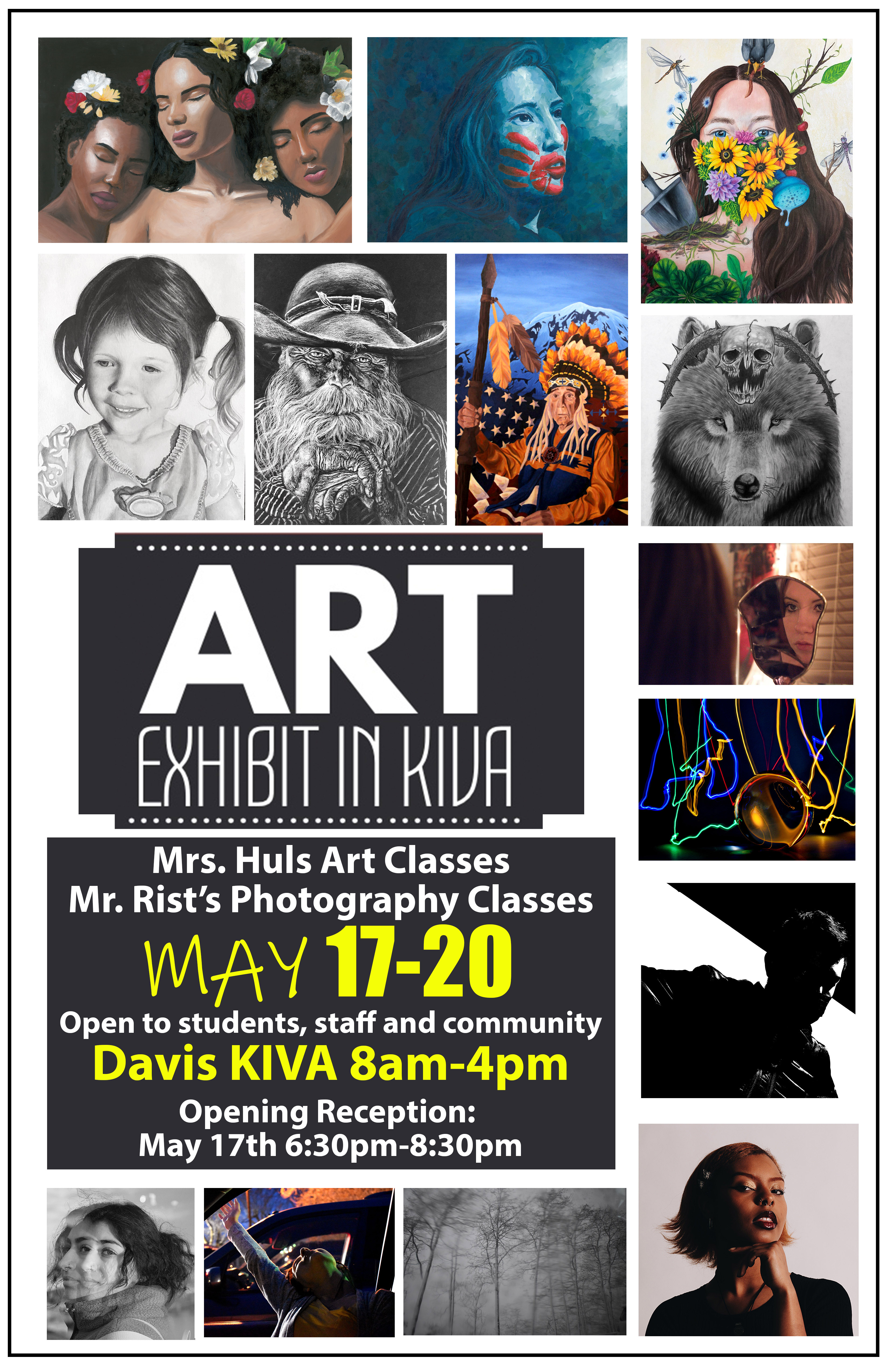 We invite you to see the incredible Davis Student Art Show. This year we will be featuring student art from, not only Mrs. Huls’s drawing and painting students’, but Mr. Rist’s photography students’ photos will be an exciting addition to our Davis Art Show. Also new this year during our opening reception night will be advanced drawing and painting students presenting as “Artists in Action” working in the center of the KIVA on their art during the gallery exhibition. Come enjoy an evening viewing beautiful and amazing work created by our outstanding Davis Art and Photography students.