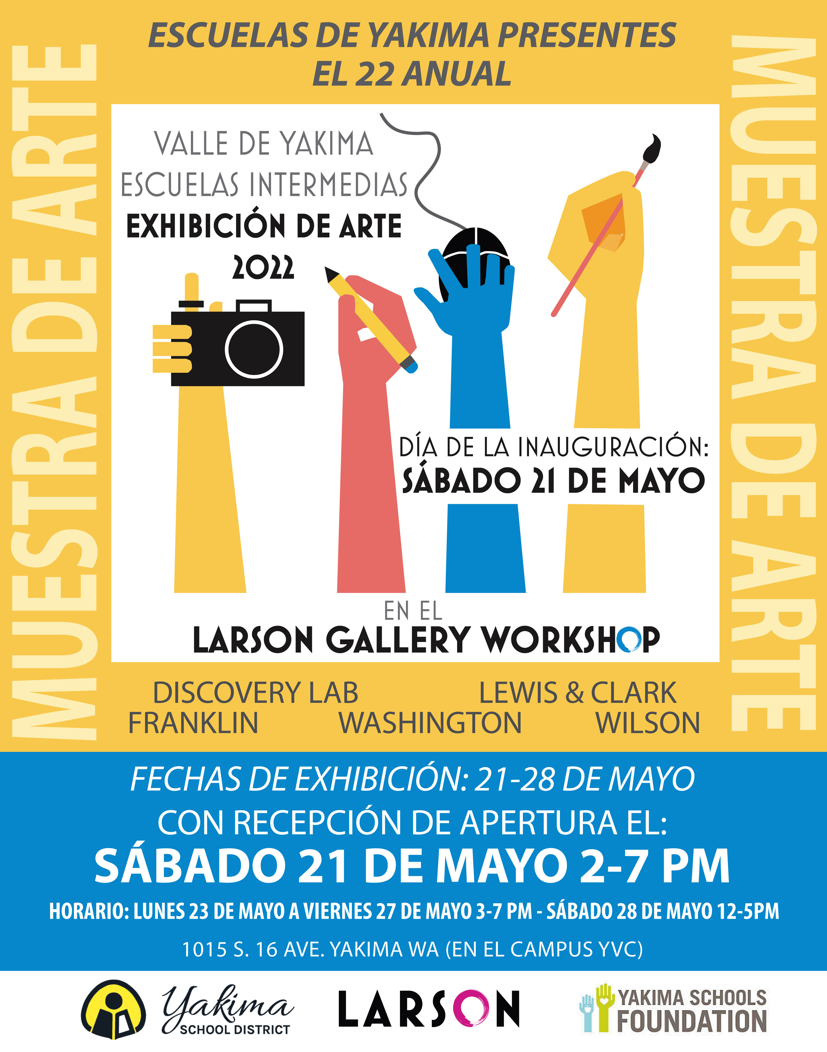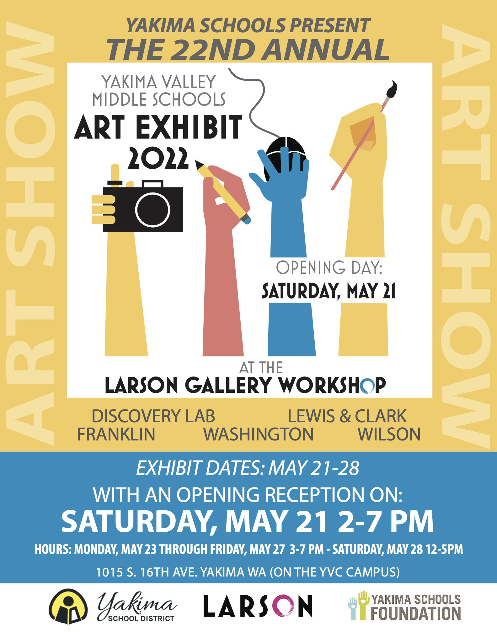 With musical performances by DISCOVERY LAB and LEWIS & CLARK MIDDLE SCHOOL students. Now in our 22nd year, we've partnered with the Larson Gallery to help celebrate the culture and diversity of Yakima Schools and have relocated our exhibit to the LARSON GALLERY WORKSHOP 1015 S. 16th Ave. (the original Larson Gallery on the YVC campus). Celebrate student art from Washington Middle School, Lewis & Clark Middle School, Wilson Middle School, Franklin Middle School, and Discovery Lab School.