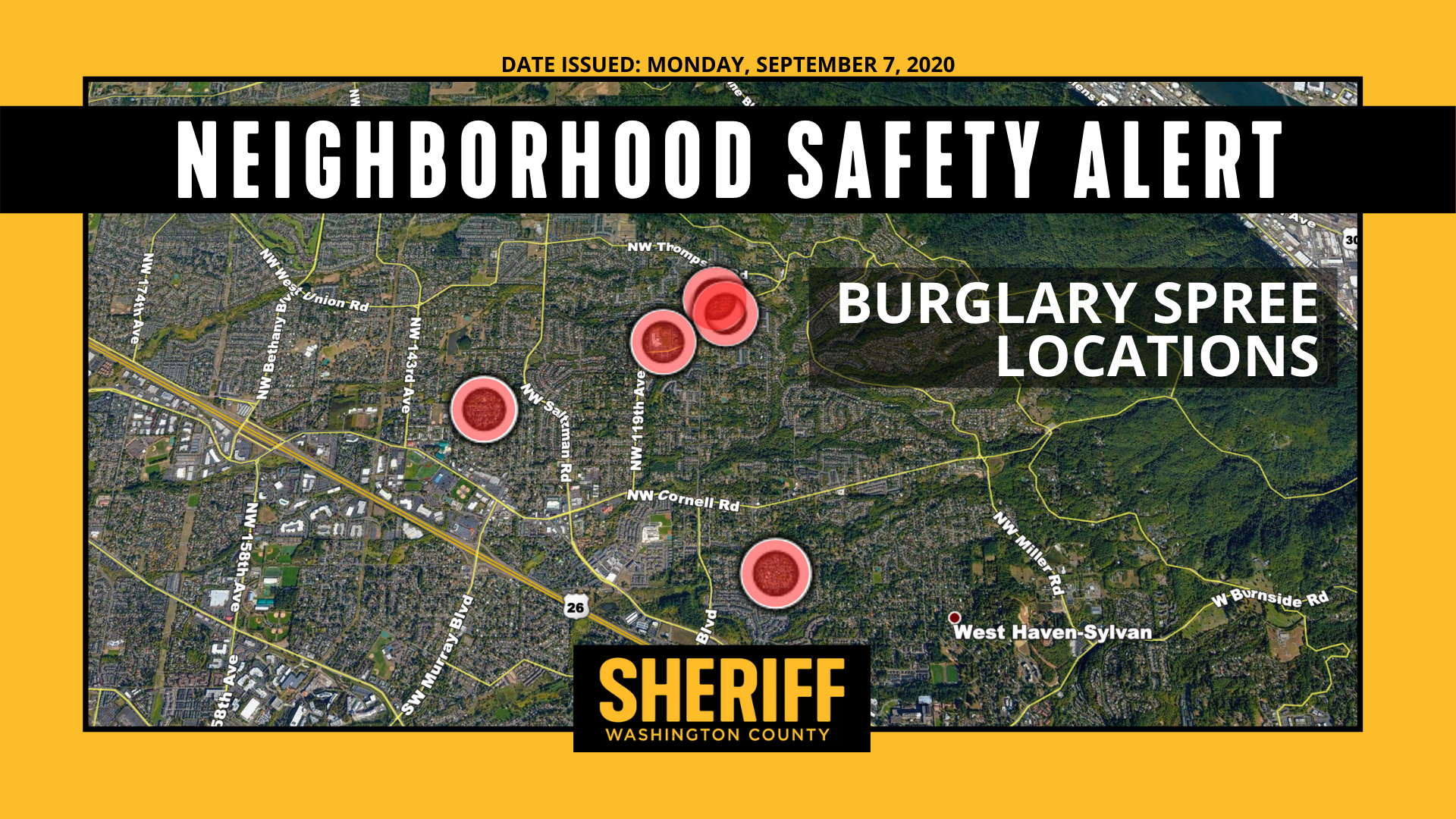 During the morning of September 7, 2020, Washington County Sheriff’s Office deputies began getting calls from people reporting a wide-spread series of overnight burglaries, stolen cars, and car break-ins. The crimes were reported at multiple addresses north of Highway 26 in and around the communities of Cedar Mill and Bethany.