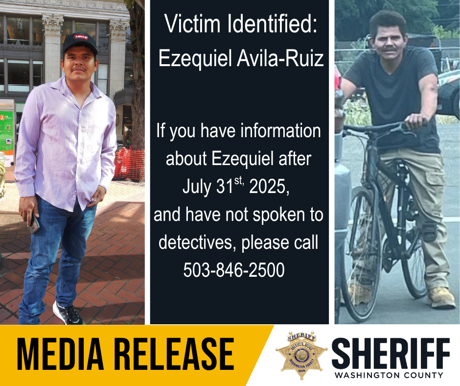 Detectives believe Avila-Ruiz was the victim of homicide and would like to speak with anyone who has information about Avila-Ruiz’s whereabouts after he was last seen on July 31st, 2025, near SE Baseline St and South First Ave in Hillsboro at approximately 5:40 p.m.