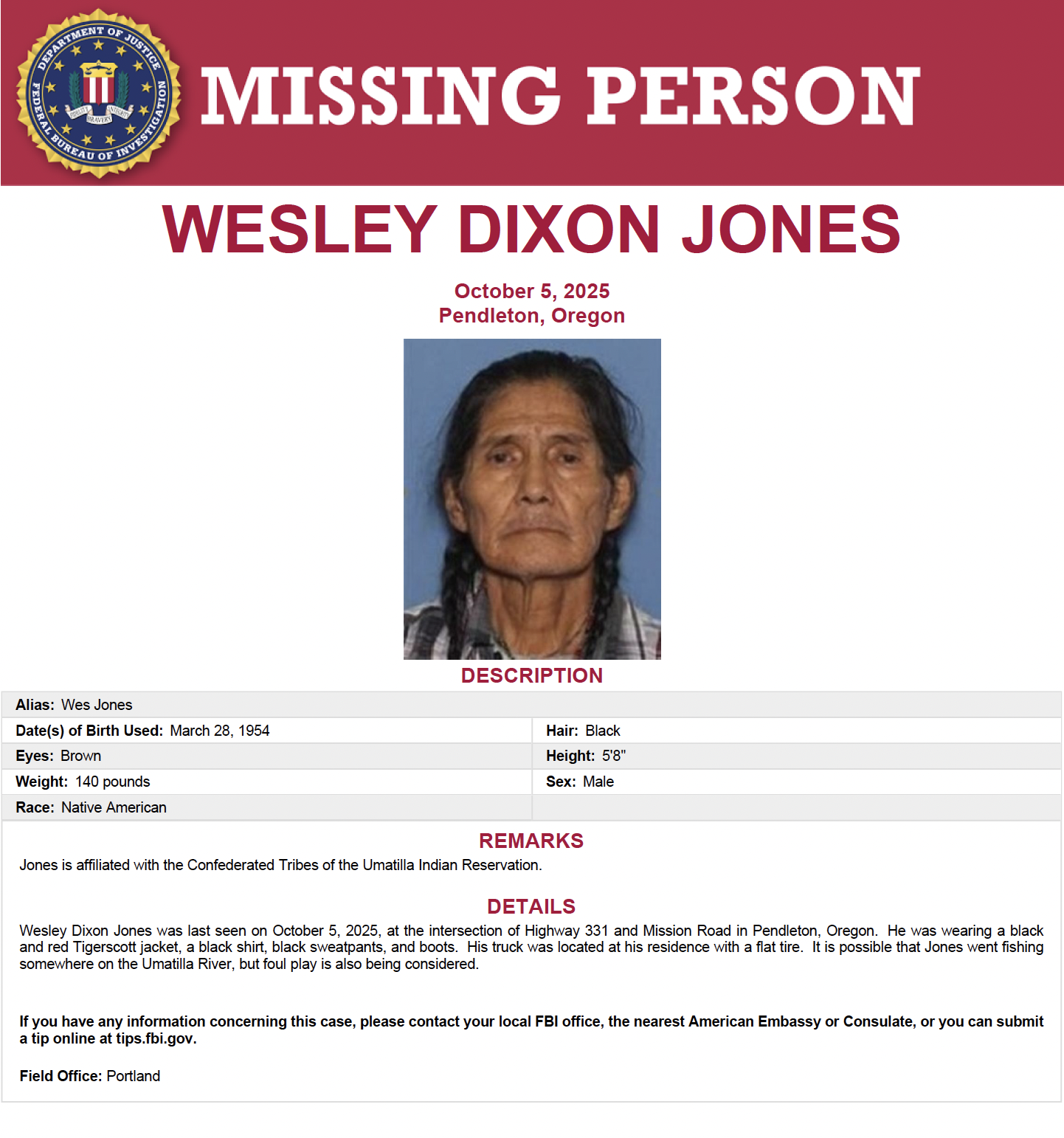 MISSING PERSON ALERT: The FBI is seeking information regarding a missing Tribal Elder from the Umatilla Reservation. Mr. Jones was last seen in Pendleton, Oregon on October 5, 2025. He may have traveled along the Umatilla River. Report tips to http://tips.fbi.gov or call Umatilla Tribal Police at (541) 278-0550.